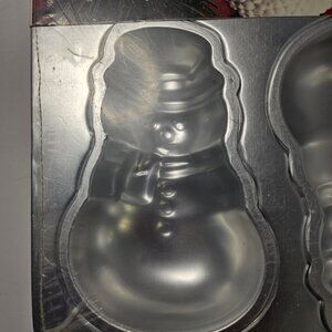 Details of this baking tray. Material is aluminum. Brand is Wilton. Color silver. Shape snowmen. Special features: Dishwasher safe. About the item: Holiday baking pan makes mini snowman cakes. Also perfect for gelatin desserts or crafts. Makes six mini snowmen. Cavity mold measures 4 5/8 inches by 2 3/4 inches by 1 inch. Condition: New in sealed package. Non smoking pet free home. GT B#1