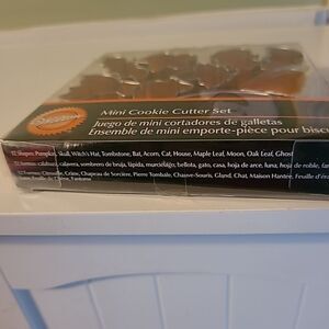 Pre-owned in new unused condition. Set of twelve mini cutters.There is a pumpkin,skull,witch's hat, tombstone, bat,acorn,cat,house,maple leaf,moon,oak leaf and ghost.Comes with a roll out cookie recipe on the back in English,Spanish and French.
