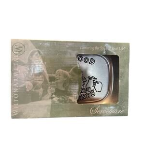 The Wiltonarmetale Serveware "Good Food Good Friends" Metal Serving Tray is a stylish and versatile piece for your kitchen or dining room. Made of durable metal, this rectangular tray features a unique "Good Food Good Friends" pattern that adds a touch of charm to your serveware collection. With a size of approximately 10 3/4" x 7", this tray is easy to fill and perfect for serving up your favorite dishes. Additionally, it is oven, refrigerator, and freezer safe, making it a convenient and practical addition to your home.