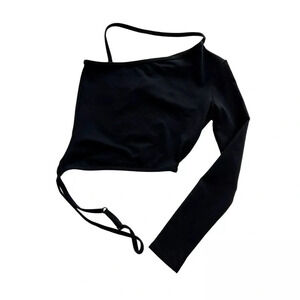 This top is cropped and features a one sleeve design, a strap detail at the neck and a stretchy material. This top comes in black.