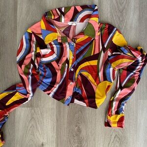 Vibrant and stylish, this multicolor abstract top is perfect for any occasion. Featuring a bold mix of colors, it adds a pop of excitement to your wardrobe.