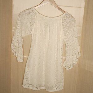 Win Win women’s cream lace new bell sleeve tunic blouse S-M. New condition .Measurements are:20” sleeve, 29” from shoulder to hem ,and 19 ½" from amrpit to armpit.