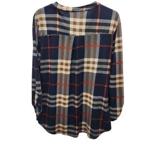 WinWin Button Sleeve Tunic Top Shirt Womens L-XL Blue Brown Plaid V-Neck Casual