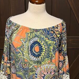 Bohemian style dress with vibrant patterns. Features lace trim on sleeves. Off-shoulder design. Perfect for casual outings.