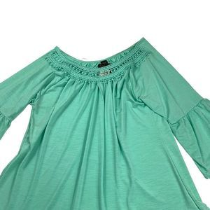 Win Win Women’s Sz XL crochet neckline tunic 3/4 bell sleeve Stretchy top