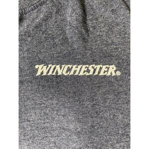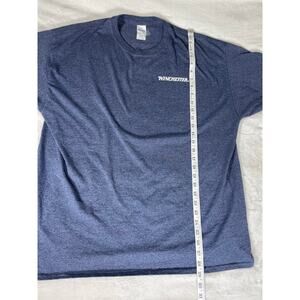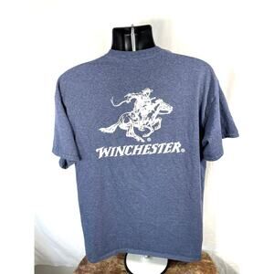 Blue Gildan Ultra Cotton Winchester graphic tee. Small logo print on front and large cowboy/horse graphic on back. Short sleeve, crew neck. Made in Haiti.