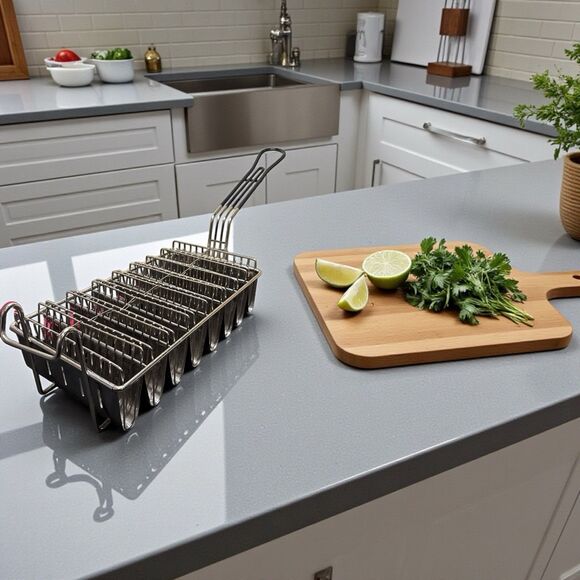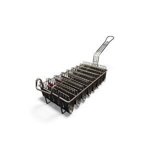 Enjoy more taco Tuesdays when you have this WinCo taco basket. This taco basket holds eight tortillas so that you can fry them without the shells sticking together. The basket is made of chrome-plated steel, which can withstand the high temperatures of deep frying. The basket has slots that separate the tortillas and curves them into an ideal taco shell shape. It works with both small and large tortillas.