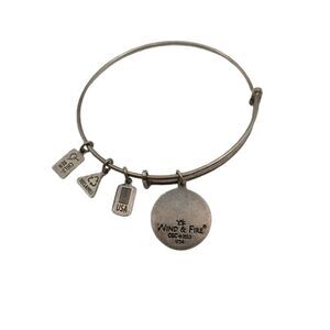 Vintage Wind & Fire bangle bracelet with a detailed Cross Fleur-De-Lis charm ✝️ in silver tone. Adjustable wire design fits most wrists. Includes three eco-conscious mini charms: “USA / Economic,” “Reclaimed / Environmental,” and “Children / Social.” Made in the USA.