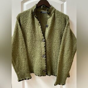 Wind River High Collar Button Down Cardigan in Olive Green featuring Resin Buttons with Abalone Shell Inlay and Edge Detail Stitching. Acrylic/Polyester Blend. Size Medium measures a 38” Chest x 23” Length. Adorable and classy sweater in Excellent Used Condition