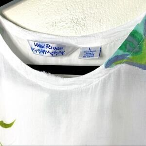 Super lightweight and flowy two piece set from Wind River. Perfect for your next beach vacation! Crewneck layered tank top, and elastic waist layered pants. Inner layer of both pieces is white, and the overlay is white with textured floral pattern. Overlay on pants has a side split hem for extra movement.