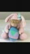 Wearing non-removable cute hooded pink bunny rabbit outfit.
