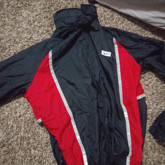 Really cool wind breaker with reflective material. The colar part has a zipper where the hood is and its stitched in. Its a sub 4 windbreaker inside is a mesh. Its a Large and Tiny bit of orange on the front but a great jacket. Thanks