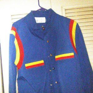 Windbreaker / blue with race stripes, snaps. Machine washable, tumble dry.