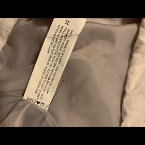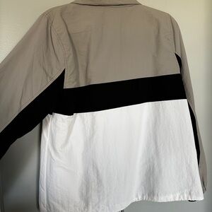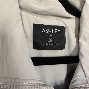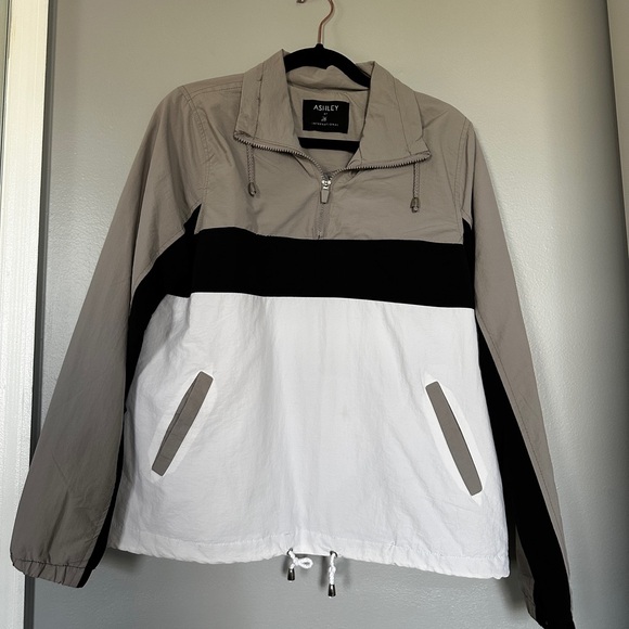 Super cute windbreaker jacket. It has pockets it the front and strings on the waist to tighten it. No damage. Pet and smoke free!