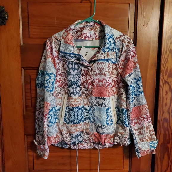 NWT LuLaRoe windbreaker with removable hood, zip & snap closure, side pockets & adjustable waist tie. Very pretty & lightweight. Fit is true size. I bought this on another selling site but I prefer a looser fit.