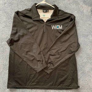 This high-quality, pullover, black-on-black, unisex, pinstripe jacket is water resistant, windproof and features a front quarter zipper and adjustable bungee cinch hem. WCM logo on left chest and on back. New, never worn. Available sizes: Large, 2X and 3X.
