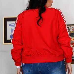 hi there today i have fir you this Red, white Le Mans racing stripes sleeve trim, long sleeves with stretchy ribbed cuffs, ribbed collar, ribbed bottom hem, zip-up front, snap button closure side pockets, lined, non-stretch, casual, sporty, wind-proof, sportswear, comfy, fall/winter collection