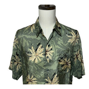 Windham Pointe Shirt Mens Large Green Tan Hawaiian Floral Silk Blend Short Sleeve Button Up Super Lightweight Beachy Coastal