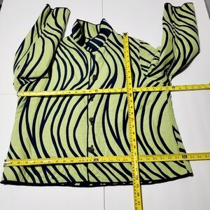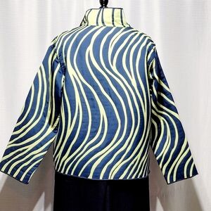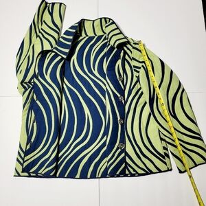 The rich tones of navy blue and green won't disappoint on either side of this reversible jacket. Combined with rose swirled double-sided buttons of gold and silver. There is only the brand tag remaining on this jacket. I found through my research: it is Made in the U.S.A. The size determined by measurements suggest an XL.