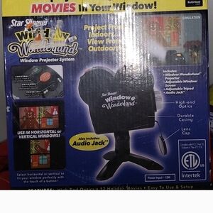 Star Shower Window Wonderland projector. Projects holiday movies indoors and outdoors. Includes audio jack and adjustable tripod.