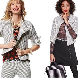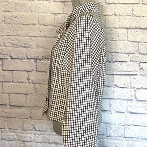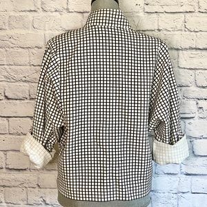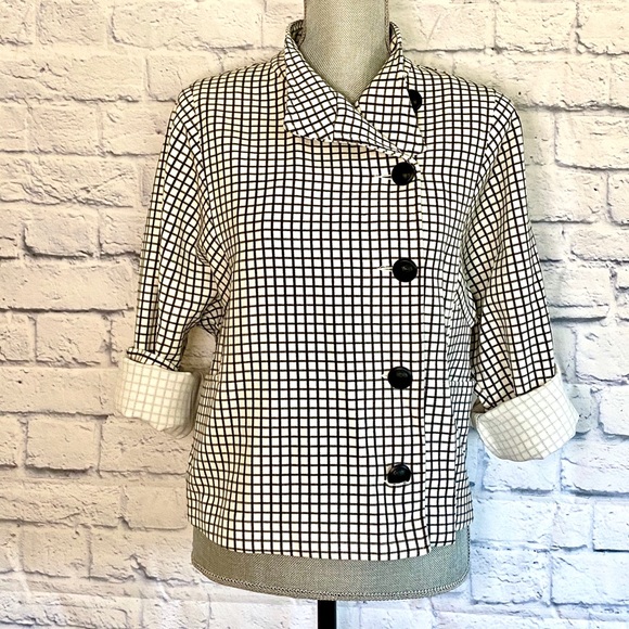 Worn once. No flaws. Stretch-ponte fabric with classy windowpane pattern and Dolman sleeves. Can be worn closed with asymmetrical buttons or open for a draped look. 63% Polyester, 34% Rayon, 3% Spandex.