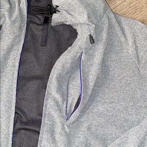 Grey wind-breaker jacket with a black mess interior. Tie-adjustment for the hood. Two lower pockets and one upper left pocket with a zipper.