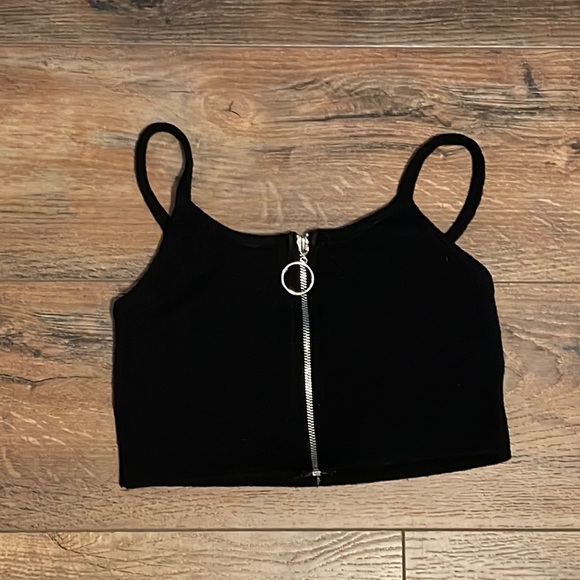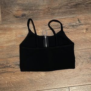 Size small, black, thin strapped, sweater crop top. Silver ring detailed zipper.