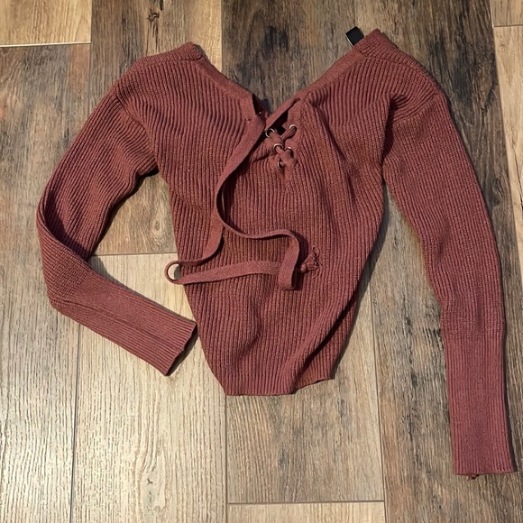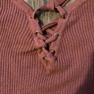 Size small, mauve, v cut knit sweater, open back.