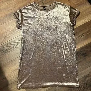 Size small, shiny beige velvet t-shirt dress. Cuffed short sleeves.