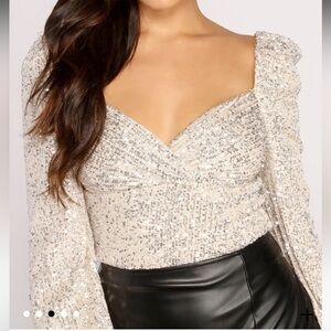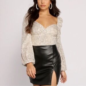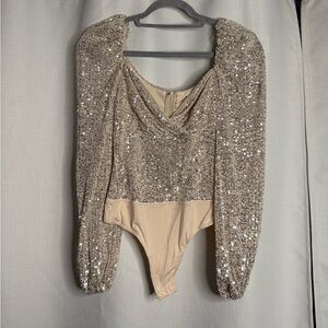 Windsor All that Glow Puff Sleeve Sequin Gold Bodysuit. Let this bodysuit bring that glow to your night out look! The bodysuit features a plunging wrap sweetheart neckline, long puff sleeves, a sequin bodice, and a contrast thong bottom. Dual snap-button closure. Lined mesh fabric. Relaxed fit, moderate stretch. Size Small.