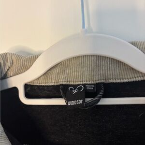 This trendy jean jacket from Windsor features a chic black denim with a contrasting cream sherpa collar. Its cropped design and vintage-inspired wash make it a stylish addition to any casual outfit.