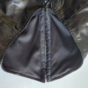 Chic black faux leather Windsor corset. Halter neckline with a sleek design with boning. Ideal for a bold, stylish look.