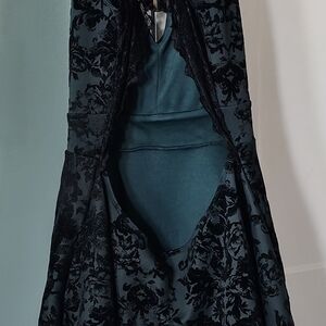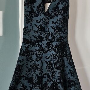 This stunning black dress from Windsor is perfect for a night out, featuring a chic halter neckline and a flattering fit and flare silhouette. The sleeveless design adds a touch of elegance, while the backless style ensures you make a statement at any cocktail event. Get a gorgeous look in this luxe layered skater dress! It features a sleeveless V-neckline, spaghetti straps that lead to a sheer lace back with a lower back cutout, a flattering high waist, and a flirty tiered skater skirt silhouette. The scuba knit fabric has an all-over flocked velvet floral pattern for a romantic vibe. Complete the outfit with block heels.