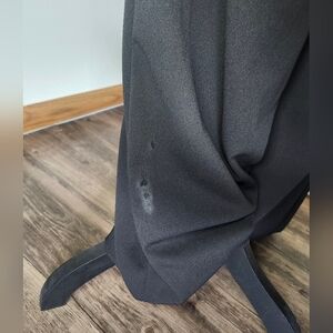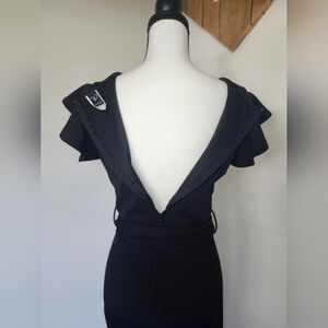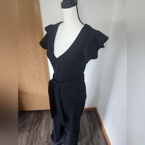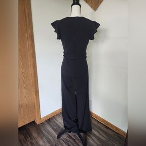 Windsor Black Flutter Sleeve Jumpsuit, good pre worn condition- see photo flaw to back of left lower leg, size medium, pit to pit 16 inches, waist 14 inches across front flat lay, length 60.5 inches, inseam 31 inches, 12.5 inches across bottom of wide flare legs, 95% polyester 5% spandex, v neck, ruffle cap sleeves, zipper closure to mid back, business professional, tie waist