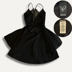Elegant with a touch of edge, this sleeveless black dress from Windsor is designed to turn heads. Featuring a fitted bodice with lace paneling and a flared skirt, it balances structure with movement. The back showcases intricate lacework and a bold gold zipper, while the cutout waist detail adds a modern twist to the classic silhouette.