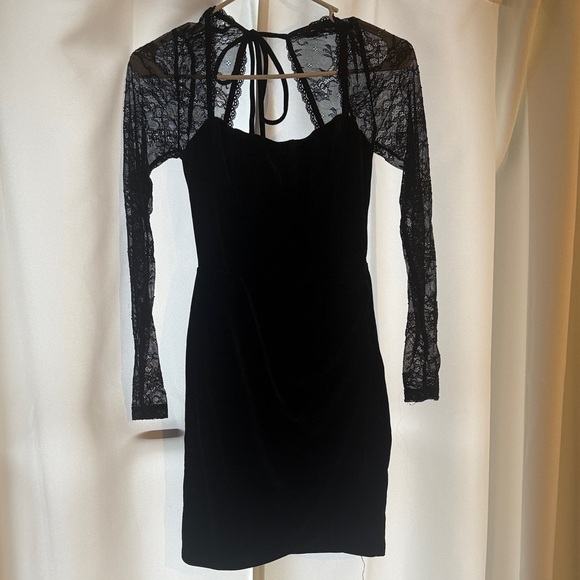 Chic black dress with lace long sleeves. Perfect for elegant occasions. Stylish and sophisticated.