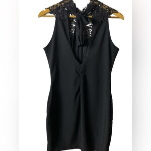 Chic black mini dress with lace overlay. Perfect for evening wear. Stylish and sophisticated.