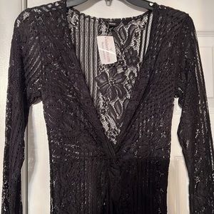 Elegant black dress with long sleeves. Features a deep V-neckline and intricate lace detailing. Perfect for evening events.
