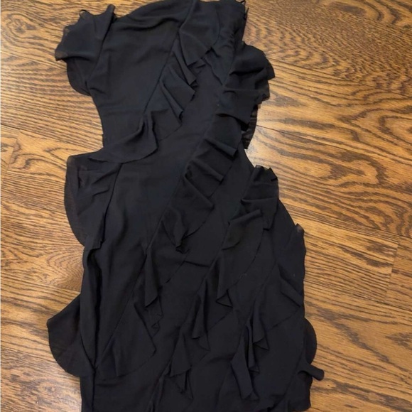 Chic black mini dress with cascading ruffles. Perfect for a night out.