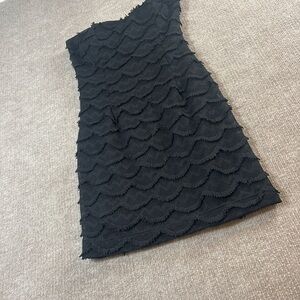 Chic and elegant strapless bodycon dress from Windsor. Designed with a unique scalloped textured overlay and fringe detail throughout. A timeless little black dress that works beautifully for cocktail parties, date nights, or formal events.