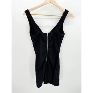 Black v-neck bandage style sleeveless bodycon mini dress. Back zipper closure.
