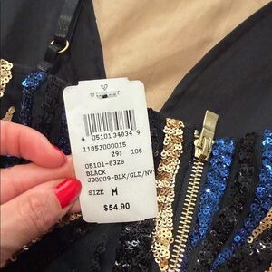 Dazzle in this Windsor mini dress. Features striking black, navy, and gold sequins. Perfect for a night out.