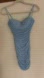 Soft pale blue ruched dress features delicate pearl-like blue bead embellishments, perfect for any special occasion.