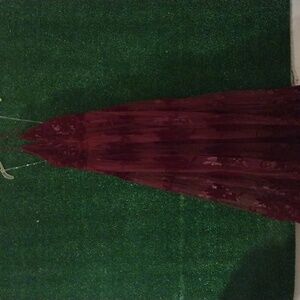 Stunning burgundy dress with intricate lace. Backless design for a bold look. Perfect for evening events.