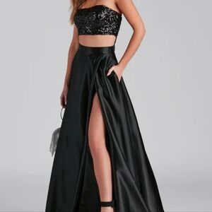 Stunning two-piece gown with a sequin top and high-slit skirt. Perfect for formal events.