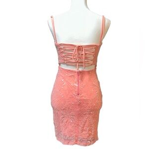 Beautiful coral mini dress with lace up back. Can tie either on top or be re-laced to tie on bottom. Zipper in back.