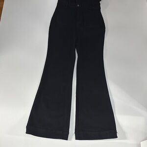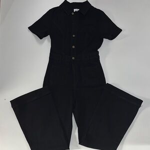 Chic wide leg black jumpsuit with button-up front. Short sleeves, front pockets, back pockets and belt loops. Perfect for versatile styling.
