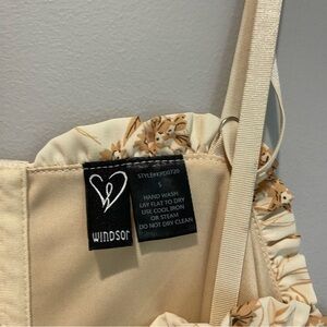 Stylish cream bustier top with floral design. Features button details and ruffled edges.