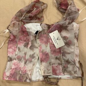 Chic floral corset crop top by Windsor. Features pink and cream hues. Sheer ruffled sleeves. Perfect for a stylish look. Size small.