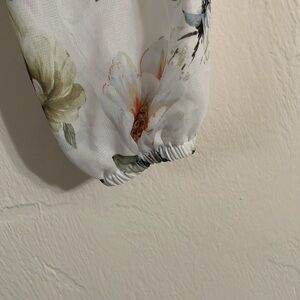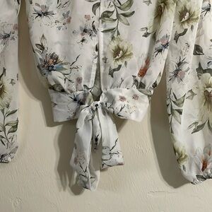 Elevate your style with this elegant floral wrap blouse. Featuring a delicate white and green pattern, this top is perfect for any occasion. The wrap design adds a touch of sophistication to your wardrobe. Women’s size small.